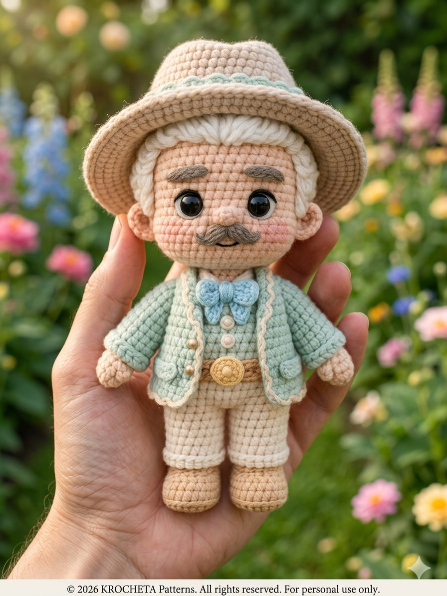​This isn’t just a project; it’s a study in structural crochet. From the perfectly rimmed fedora to the scalloped edging of the sage blazer, every stitch serves a purpose. Designed for the advanced maker, this doll features complex facial needle-sculpting to create a kind, lived-in expression, complemented by a meticulously textured mustache and silver-fox hair. Whether you are looking to elevate your personal collection or create a museum-quality gift, this pattern provides the blueprint for excellence.